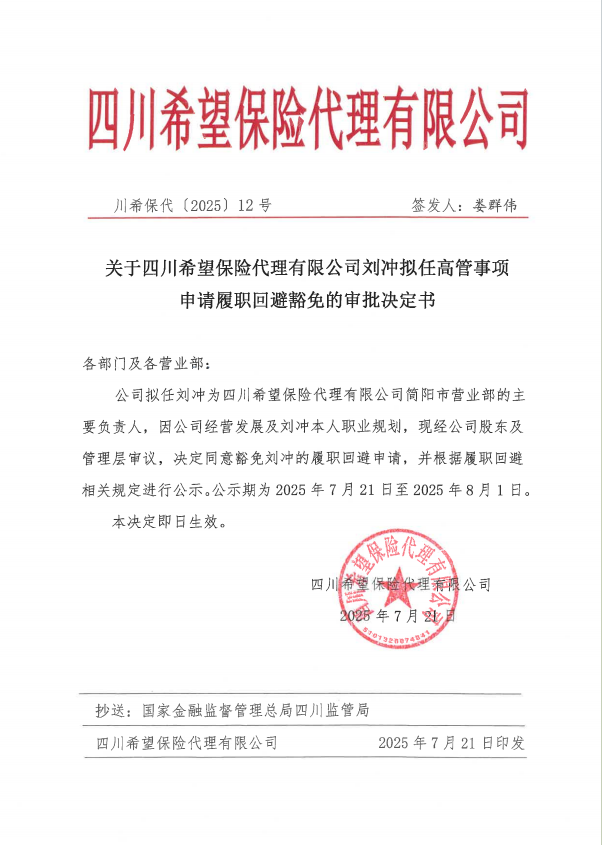 关于刘冲拟任高管事项申请履职回避豁免的审批决定书